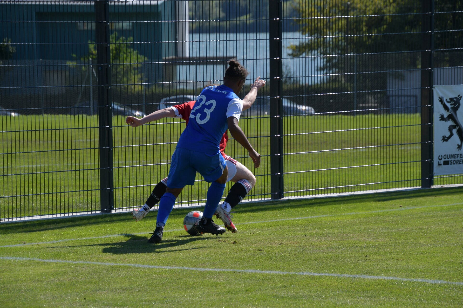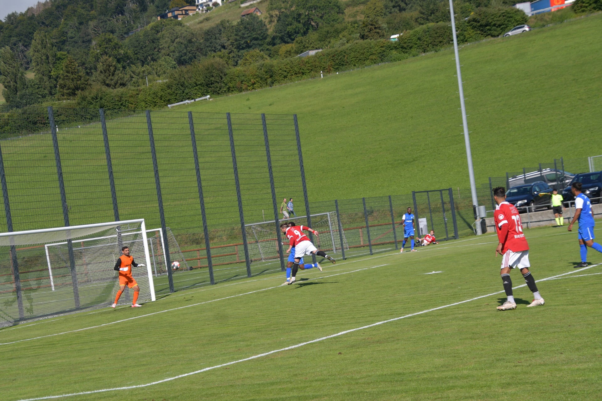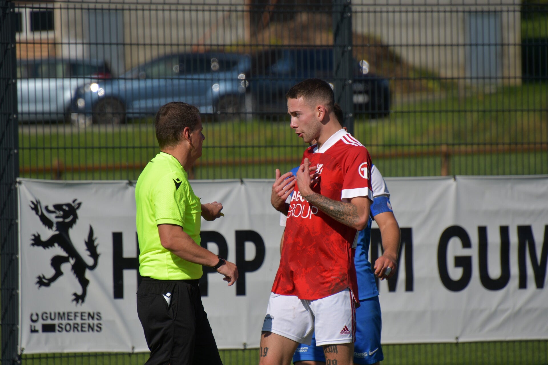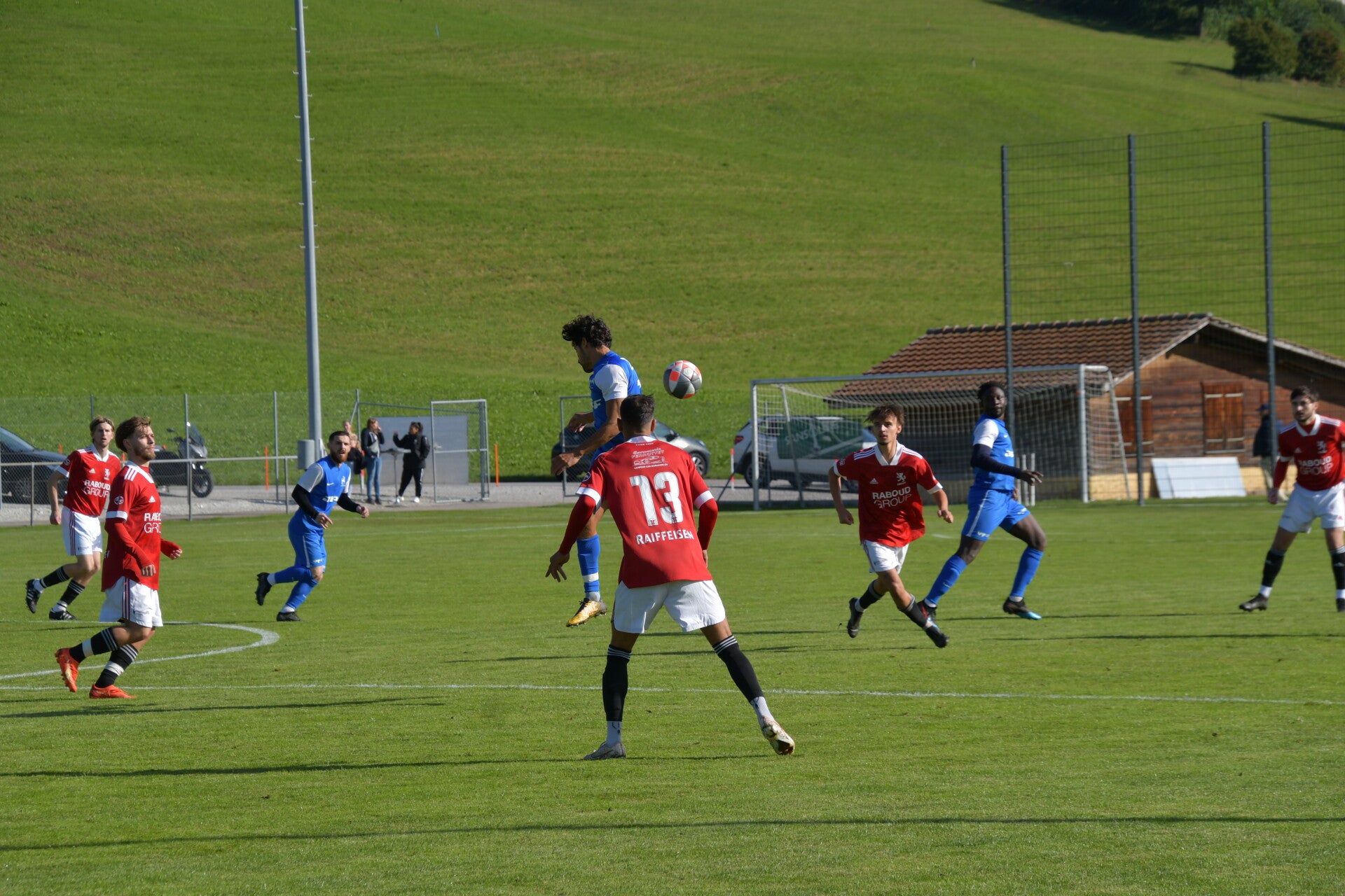 S'en suit de vaines protestations des joueurs de Haute-Gruyère, qui se sont longuement entretenus avec l'arbitre Lionel Gothuey, sans succès. Les contestations étaient infondées, et le jeu a repris avec une intensité croissante. Gumefens/Sorens, toujours portés vers l'avant, s'est créé plusieurs occasions sans parvenir à doubler la mise. De son côté, Haute-Gruyère ne s'est montrée dangereux que sur les coups de pied arrêtés, notamment sur les corners. C'est d'ailleurs lors de l'un d'eux que l'équipe a perdu son capitaine, expulsé pour un geste aussi grossier qu'inutile sur Nicolas Schneuwly à la 30e minute. Le score est conservé jusqu'à la pause, avec un avantage toujours en faveur de Gumefens/Sorens