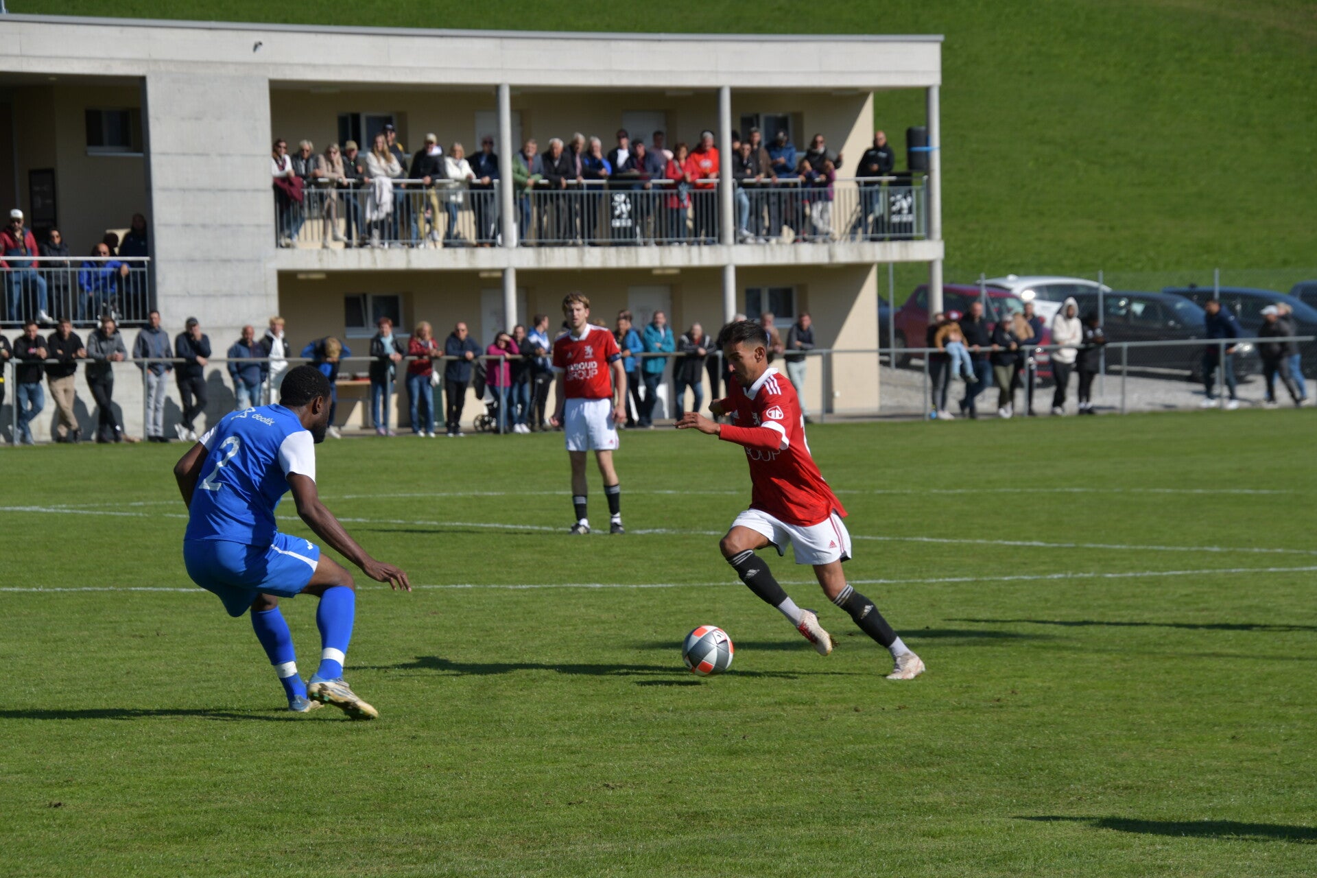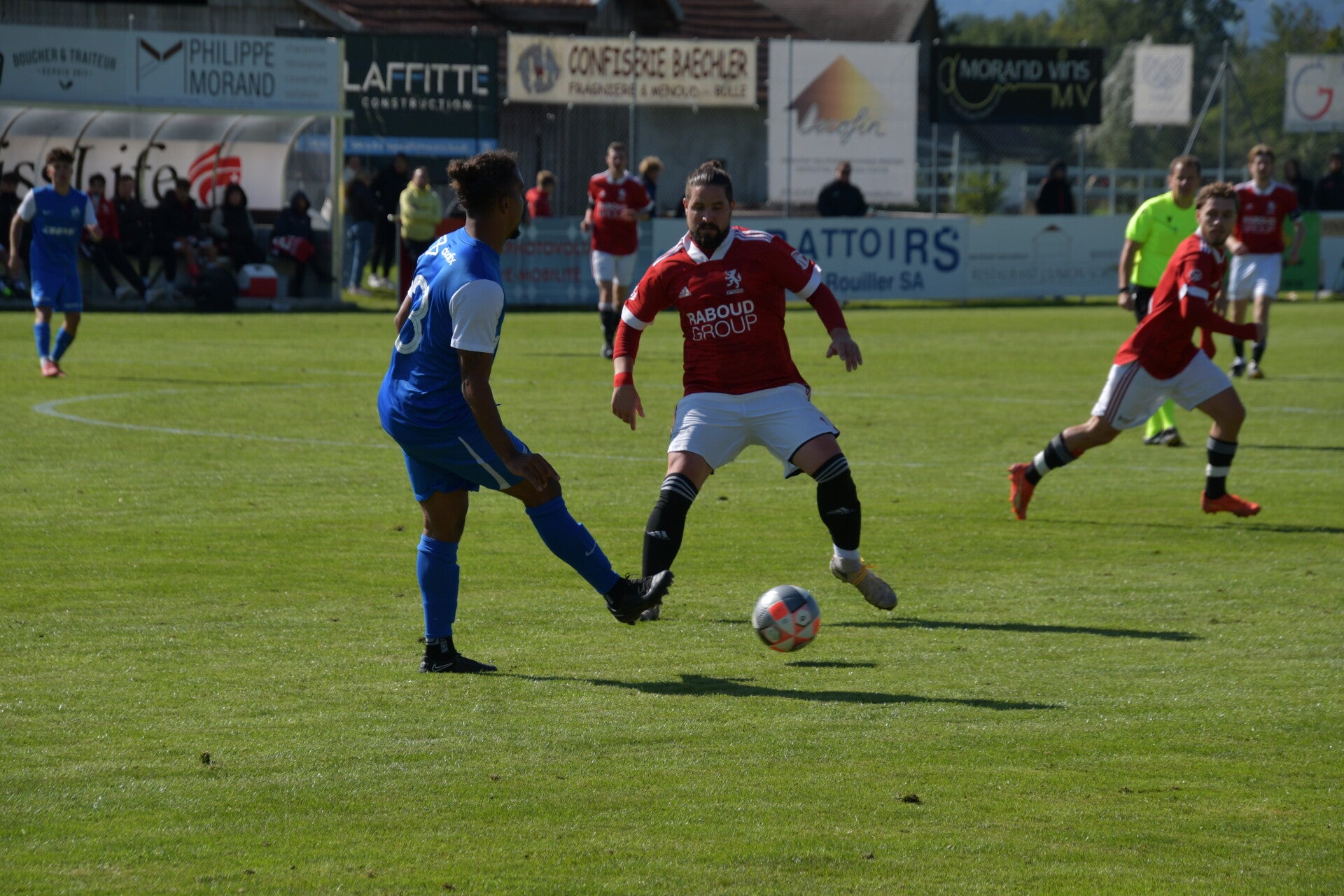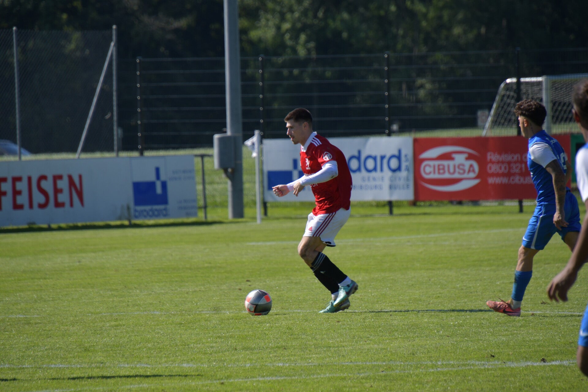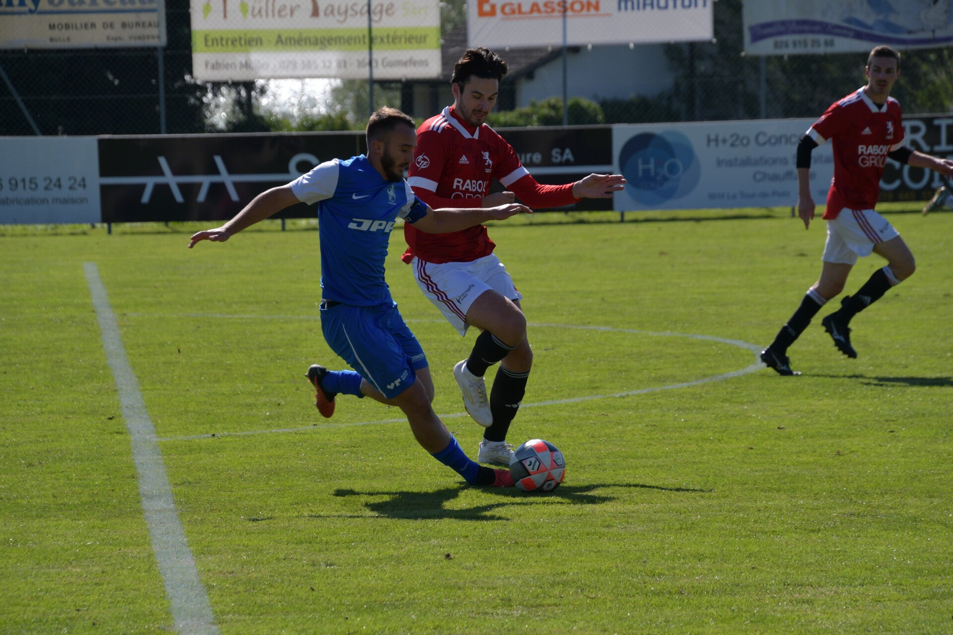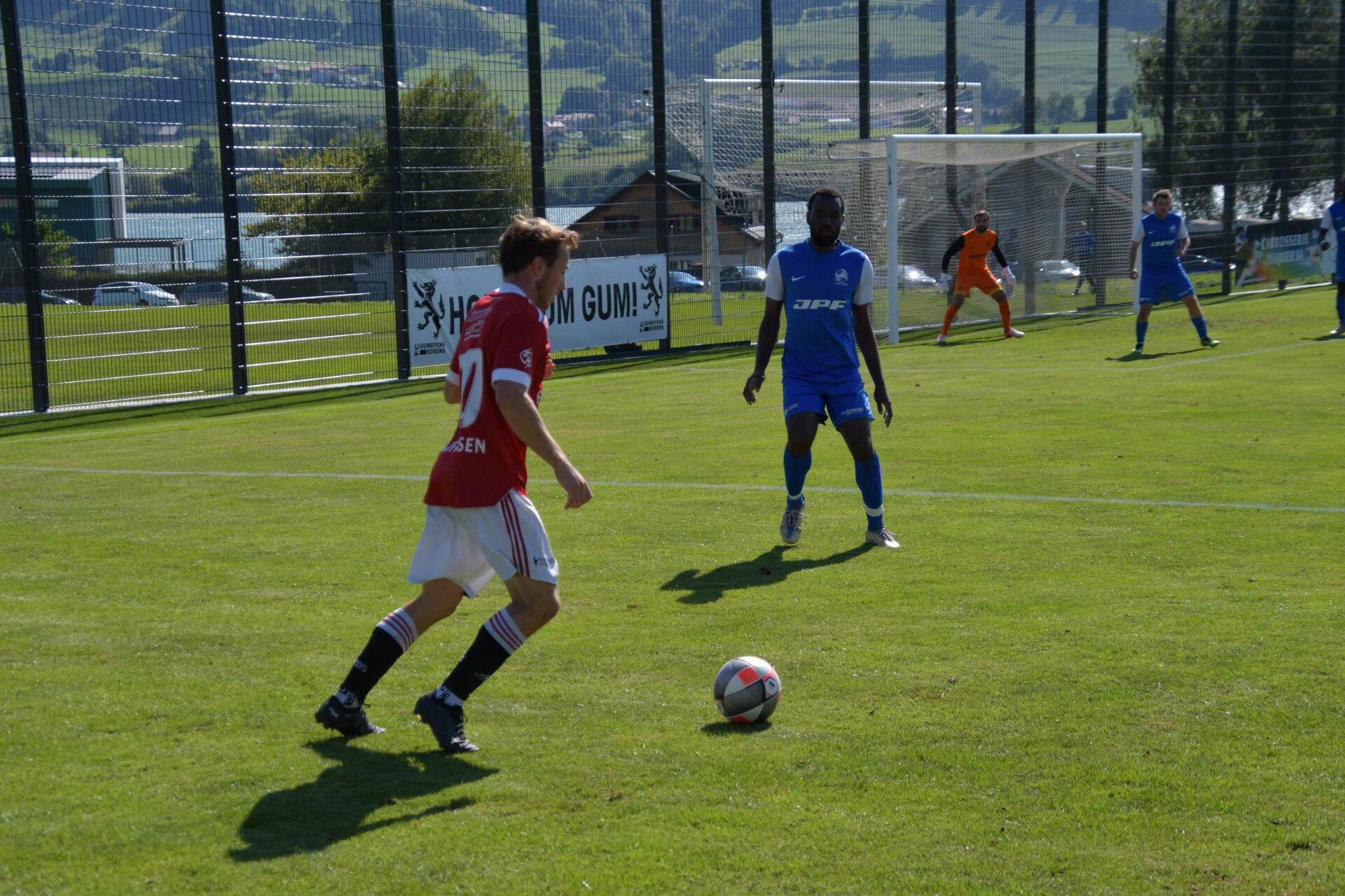 Le derby de la Gruyère, disputé lors de cette 5e journée du championnat de 2e ligue fribourgeoise, a vu l'équipe de Gumefens/Sorens dominer nettement le FC Haute-Gruyère dans une rencontre marquée par une froide bise. Dès le coup d'envoi, les joueurs de Gumefens/Sorens se sont précipités à l'assaut des buts adverses. Leurs efforts ont rapidement été récompensés grâce à un coup franc astucieusement joué aux abords des 20 mètres. Alors que la défense de Haute-Gruyère, peinait à se replacer, Batiste Maillard, bien décalé, n'a eu aucun mal à trouver le chemin des filets pour ouvrir le score dans une cage vide.